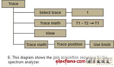 用于頻譜分析器的功能序列顯示在圖6中。線跡1設(shè)定為計(jì)算“線跡1”減去“線跡2”,后者包含了輸入功率。這樣,新獲取的輸出功率將提供一個(gè)以dB為單位的增益圖。“線跡位置”特征被用作獲得直接讀取以dB為單位的絕對(duì)增益的一個(gè)偏差。線跡偏差被設(shè)置為“輸出偏差”減去“輸入偏差”。這種情況下,“輸入偏差”在校準(zhǔn)階段被確定為30.7dB,結(jié)果得到偏差值為13dB。該值不能直接作為以dBm為單位的偏差值加入,因?yàn)?ldquo;線跡位置”清單只接受作為Y刻度百分比的輸入。旋轉(zhuǎn)鈕用來(lái)獲取與13dB偏差值相對(duì)應(yīng)的正確百分比。圖7中的藍(lán)線即為所得。