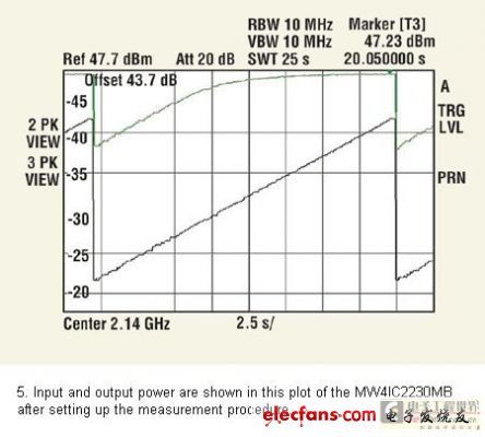 用于頻譜分析器的功能序列顯示在圖4中。此刻,頻譜分析器連接到輸入,且輸入功率在第二條線跡(線跡2)獲取,并保持在“觀察”模式。圖5中的黑色線跡即得。當(dāng)在輸出再連接分析器之后,從第三條線跡(線跡3)獲得輸出功率,同樣也保持在“觀察”模式。通過(guò)設(shè)置“輸出偏差”值的參數(shù)等級(jí)偏差,該值在校準(zhǔn)階段被設(shè)為43.7dB,從“線跡3”可以直接讀取以dBm為單位的絕對(duì)輸出功率,圖5中的綠線即得。通過(guò)在鋸齒末端的平面區(qū)域安置標(biāo)記,可以讀取如圖5 中綠線所示的飽和功率。MW4IC2230MB顯示+47.23dBm的飽和功率。
