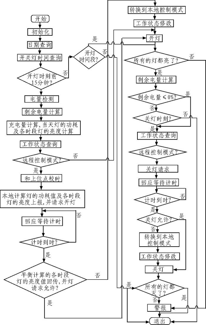 進(jìn)行太陽能路燈電池板電流檢測,蓄電池電壓檢測,蓄電池電量監(jiān)測,以及環(huán)境溫度的檢測,采用光開時關(guān),并實時上傳工作環(huán)境及狀態(tài)數(shù)據(jù),預(yù)警故障,保證系統(tǒng)的可靠性。圖2為太陽能路燈的開、關(guān)控制流程網(wǎng)。