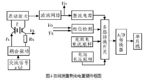 給電池施加一個固定頻率和固定電流(日前一般使用l kHz頻率、50 mA小電沆),然后對其電壓進(jìn)行采樣,經(jīng)過整流、濾波等一系列處理后通過運放電路計算出該電池的內(nèi)阻值。圖4為在線測量剩余電量硬件框圖。