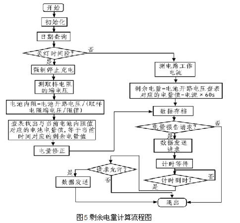 通過計算電流在時域上的積分,可得出電量變化值,在路燈工作前檢測到的電池電量作為初始電量,則剩余電量為初始電量減去電量變化值。同時通過對MPPT電路的輸出電流做積分,作為電量變化的校正值,從而得到較準(zhǔn)確的剩余電量值。圖5為剩余電量計算流程圖。