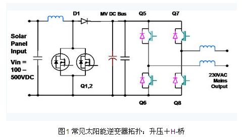升壓+H-橋拓?fù)涫翘柲苣孀兤鳂O為常用的拓?fù)渲?,是一種兩級非隔離拓?fù)?。其第一級是升壓級,用于把模塊的可變輸出電壓(例如100V – 500V)升高到更大的中間電壓,后者必須大于實(shí)際峰值主線電壓(如230V x sqrt(2),或>325V)。該升壓級還有一個重要作用,就是為了實(shí)現(xiàn)效率最大化,太陽能模塊必須運(yùn)作產(chǎn)生盡可能大的功率,而太陽能模塊的功率 曲線可通過輸出電流乘以輸出電壓數(shù)值獲得。功率特性中有一個最大點(diǎn),被稱為“最大功率點(diǎn)”或MPP,而這精確位置會隨著模塊的類型、溫度和日照陰影等因素而變化。