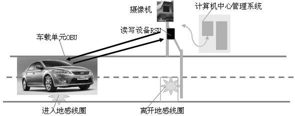 OBU 中存有車輛的識別信息,如車牌號、汽車ID號,一般安裝于車輛前面的擋風玻璃上,RSU安裝于收費站旁邊,環(huán)路感應(yīng)器安裝于車道地面下。中心管理系統(tǒng)有大型的數(shù)據(jù)庫,存儲大量注冊車輛和用戶的信息。當車輛通過收費站口時,環(huán)路感應(yīng)器感知車輛,路邊單元發(fā)出詢問信號,車載單元做出響應(yīng)。并進行雙向通信和數(shù)據(jù)交換,中心管理系統(tǒng)獲取車輛識別、車型等信息并和數(shù)據(jù)庫中相應(yīng)信息進行比較判斷,根據(jù)不同情況來控制管理系統(tǒng)產(chǎn)生不同的動作。通過路邊單元與車載單元進行相互通信和信息交換,以達到對車輛的自動識別,并自動從該用戶的專用帳戶中扣除通行費,從而實現(xiàn)自動收費。