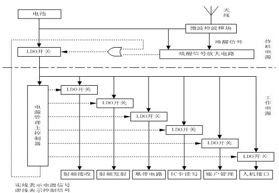 如OBU這種以嵌入式處理器為核心的系統(tǒng),其功耗主要由處理器功耗和外圍電路功耗組成??紤]實際的運行情況,汽車在公路上行駛的整個過程中,經(jīng)過收費站的時間是非常短的,OBU只需要在汽車經(jīng)過收費站時工作,而且工作時間不到一秒鐘,其他絕大部分時間都不需要工作。OBU智能電源管理采用電池供電的方法,控制OBU 工作在兩種模式,睡眠模式和激活模式;當車進入收費站時,OBU被激活,開始工作,處于激活模式;當交易完成,車離開收費站后,OBU馬上停止工作進入睡眠模式。根據(jù)這種特點,對電源采用分級管理的策略,即分為待機電源與工作電源,如圖2.1。