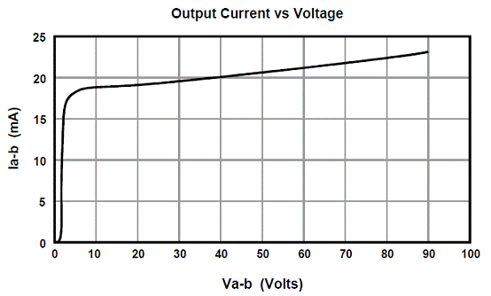 它在某一個電壓范圍內(nèi)有一段恒流區(qū)間,在這個區(qū)間,流經(jīng)的電流幾乎不變,VL為到達IL的電壓值,IL大約為0.8Ip,Vb為擊穿電壓值。但是實際的恒流二極管并不是那么理想。圖3是美國Supertex的CL1恒流二極管的特性。它的電流仍然會隨電壓而有所增加。
