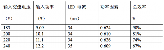下面舉一個實測的結(jié)果為例,這是一個80顆3014串聯(lián)的球泡燈,采用了5顆Semitek 的S-562T并聯(lián)。它在不同的輸入市電電壓時,所測得的結(jié)果如下表所示。