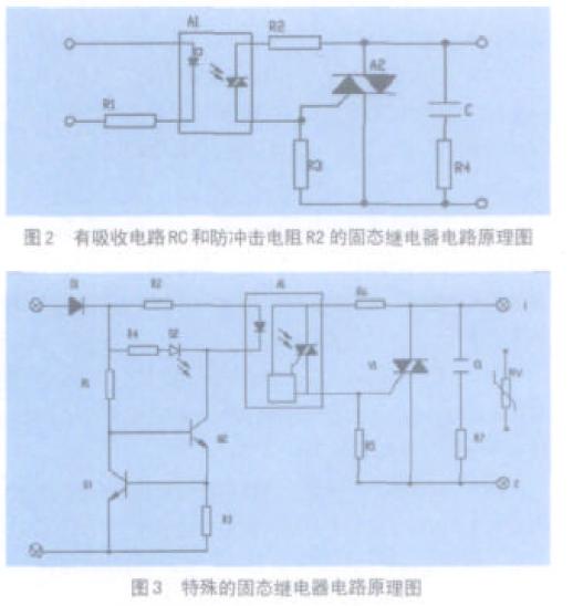 圖1、圖2 和圖3 三種電路都能實(shí)現(xiàn)固態(tài)繼電器的功能。圖1 是固態(tài)繼電器最簡單的電路原理圖,圖中A1 是交流光耦,A 2 是雙向可控硅。常用在小型的S S R ,使用時(shí),用戶往往在外面增加器件來改善性能。圖2 是在圖1 的基礎(chǔ)上增加了RC 吸收電路和防沖擊電阻R2 。R 2是保護(hù)光耦,抑制在導(dǎo)通瞬間流過光耦的沖擊電流。附加這些器件后,大大改善了SSR 的EMC 特性和浪涌對光耦的沖擊性能。因此該電路常用在可靠性較高的場合。圖3 是一種特殊的電路,常用在高可靠性和E M C 等級較高的SSR 設(shè)計(jì)中。圖中的二極管D1 可防止輸入反極性。由Q1、Q2、R1 及R3 組成恒流電路,保證當(dāng)輸入電壓變化時(shí),光耦A(yù) 1 的電流恒定。R C 電路C 1 、R 7 和R 6 的功能與圖2 的相同。該電路還增加了壓敏電阻R V 。R V不僅加強(qiáng)了S S R 的過壓保護(hù)能力,而且大大改善了其E M C 性能。
