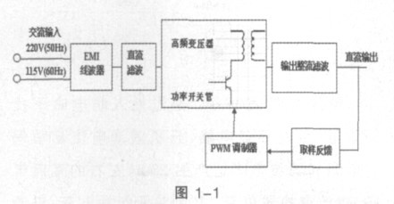 以上四種調(diào)制方式以脈沖調(diào)寬開關(guān)電源在實(shí)際應(yīng)用中最為廣泛?;緲?gòu)成如圖1- 1 所示,主要由以下6 部分組成。