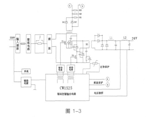 當(dāng)輔助電源無電壓輸出時(shí),CW1525 驅(qū)動(dòng)電路無法工作,開關(guān)電源無電壓輸出,應(yīng)檢修輔助電源,當(dāng)輔助電源正常,應(yīng)檢查CW1525 驅(qū)動(dòng)輸出電路, 可采用斷開驅(qū)動(dòng)?xùn)艠O方法辨別CW1525 驅(qū)動(dòng)電路的好壞,同時(shí)采用分段測(cè)量方法檢查雙功率管是否開路,重點(diǎn)檢查CW1525 控制電路、熱保護(hù)電路、過壓保護(hù)電路等,以上幾種電路中只要有一種出現(xiàn)故障,均會(huì)出現(xiàn)無電壓輸出。又如輸入電壓正常,輕載工作正常,當(dāng)測(cè)量時(shí),加載電流達(dá)到實(shí)際輸出電流的80%時(shí),輸出電壓正常無下降狀況,開關(guān)電源突然關(guān)斷,無電壓輸出,減載開機(jī)輸出電壓正常。對(duì)此可判別出是因短路過載取樣電路電壓出現(xiàn)故障。正常情況下,一般取樣分流電阻增大,使互感器經(jīng)二極管D1、D2 兩端電壓升高,短路保護(hù)提前動(dòng)作所致。合理調(diào)整D1、D2 兩端分流電阻R3 阻值就達(dá)到修復(fù)此故障的目的。