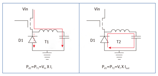 當(dāng)時間為T2時,輸出電流(Iout)流經(jīng)D1。所產(chǎn)生的損耗與D1的正向電壓(Vfw)和輸出電流直接相關(guān)。PT2等于Iout*Vfw。顯然,我們希望盡可能降低以控制損耗,減少發(fā)熱。