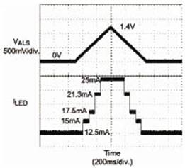 通過(guò)將背光調(diào)整到合適的水平,就可以顯著減少?gòu)碾姵匚盏墓β省D3顯示了一種使用情況,突出了在5個(gè)亮度區(qū)使用系統(tǒng)可能實(shí)現(xiàn)的電力節(jié)?。宏?yáng)光、陰天室外、明亮的辦公室、昏暗的房間、夜間/電影院。亮度值分別設(shè)置為100%、85%、70%、60%和50%(25mA、21.3mA、17.5mA、15mA和12.5mA)。由于ALS的電壓上升(或通過(guò)傳感器增加環(huán)境光),在驅(qū)動(dòng)器迫使LED電流變化之前,驅(qū)動(dòng)IC在預(yù)定時(shí)間內(nèi)對(duì)ALS電壓采樣。規(guī)定(或平均)時(shí)間內(nèi)的ALS電壓采樣有助于防止在瞬息萬(wàn)變的照明條件下出現(xiàn)LED閃爍。