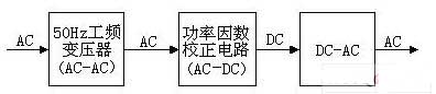 1. 三級(jí)構(gòu)成方案Ⅰ。其結(jié)構(gòu)如圖3所示。第一級(jí)是50Hz工頻變壓器,用來實(shí)現(xiàn)電氣隔離功能,從而保證電源設(shè)備的安全性,免受來自高壓饋電線的危險(xiǎn)。第二級(jí)是功率因數(shù)校正電路,用來強(qiáng)迫線電流跟隨線電壓,使線電流正弦化,提高功率因數(shù),減少諧波含量,其輸出是400V左右的高壓直流。第三級(jí)是DC-AC模塊,用來實(shí)現(xiàn)逆變功能,即通過控制逆變電路的工作頻率和輸出時(shí)間比例,使逆變器的輸出電壓或電流的頻率和幅值按照人們的意愿或設(shè)備工作的要求來靈活地變化。