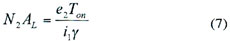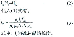 式中:e2為次級感應(yīng)電壓,Ton為導(dǎo)通時間,N2為次級線圈匝數(shù),Ae為磁芯有效截面積,△B為工作磁感應(yīng)強度,單位為特斯拉(T)。