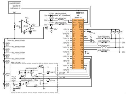 圖 1:6節(jié)電池監(jiān)視系統(tǒng)的簡(jiǎn)化原理圖。LTC6803 測(cè)量電池電壓并控制外部電池放電晶體管。LT1999 測(cè)量至電池組的充電和放電電流。