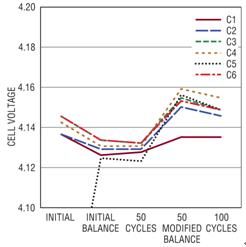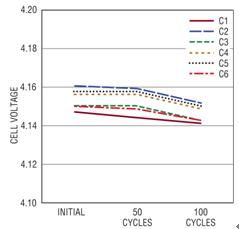 電池組 1 經(jīng)過了 100 個(gè)充電 / 放電周期,圖 3 顯示若干周期后記錄 6 節(jié)電池的電壓。該圖顯示,經(jīng)過短暫停頓后,在一個(gè)完整的充電周期結(jié)束時(shí)所測(cè)得的電池電壓。充電后,電池電壓之間的不平衡與容量和內(nèi)部電阻的小量變化有關(guān)。在第一個(gè)完整的周期中,測(cè)得的電池組容量為 2.072AHr,經(jīng)過 100 個(gè)周期后,所測(cè)得的容量為 2.043AHr,隨著周期數(shù)增加,容量有少量下降。還有一種趨勢(shì),即隨著充電 / 放電周期數(shù)的增加,充電后電池的最終電壓下降了,100 個(gè)周期以后,這種趨勢(shì)尤其顯著。這種趨勢(shì)最有可能是因?yàn)殡姵乩匣痣姵貎?nèi)部電阻的小量增加導(dǎo)致的。內(nèi)部電阻增加使電池更快地達(dá)到充電結(jié)束門限。盡管在工作時(shí)沒有平衡,這個(gè)電池組在 100 個(gè)周期中自始至終保持著同樣程度的不平衡。能像這個(gè)電池組一樣,每節(jié)電池自然而然相互匹配的電池組相當(dāng)罕見。