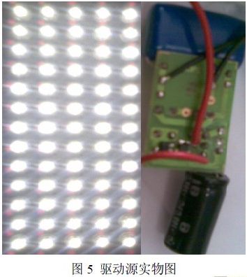 為了進(jìn)一步驗證了基于恒流二極管的小功率LED 驅(qū)動電路的可行性。制作了驅(qū)動65 顆(5*15方式連接)0.06 W 白光LED 的驅(qū)動源,其中降壓電容C1 為1.5 μF,濾波電容C2 為1000 μF,恒流二極管為兩顆2DHL040 并聯(lián),并利用萬用表對電流電壓進(jìn)行測量。實際測得輸入電壓在196~248 V范圍內(nèi)輸出電流恒定為80 mA,相當(dāng)于流過每個LED 電流為 16 mA。在219 V 輸入電壓條件下,整個電路消耗的功率為 7.1 W ,則驅(qū)動源的功率因素為 0.47。圖5 為制作的小功率驅(qū)動源實物圖。