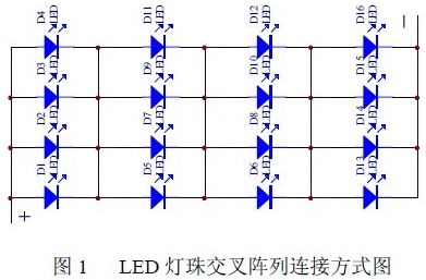 從圖中可以看出當(dāng)其中個別LED 短路或斷路,也不會引起整個燈組熄滅。這種交叉陣列連接方式具有線路簡單,亮度穩(wěn)定,可靠性高,對驅(qū)動要求較低等特點。