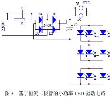 基于恒流二極管的市電供電小功率LED 驅(qū)動電路如圖3 所示: