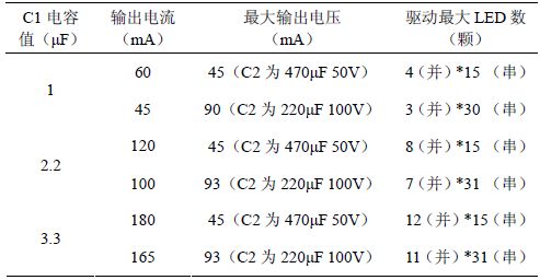 C1 為降壓電容,電容降壓電路輸出電流主要與降壓電容容量和輸出電壓有關(guān),輸出電壓越高電流越小。理論上驅(qū)動電路輸出電壓可以達(dá)100 V 以上,但考慮到高電壓下濾波電容C2 的體積較大,不易于電路安裝,本文設(shè)計的驅(qū)動電路主要使用50 V和100 V 的濾波電容。雖然電容容值越大驅(qū)動電路輸出電流越大,但降壓電容值太大會降低整個驅(qū)動電路的安全特性與穩(wěn)定性,因此建議降壓電容的容值不要超過3.3 μF。下表1 給出了采用0.68~3.3 μF不同大小降壓電容,驅(qū)動電路在不同電壓下提供的電流以及能夠驅(qū)動的最多LED 數(shù)量。(此表中的數(shù)據(jù)為多次實驗與仿真所得)