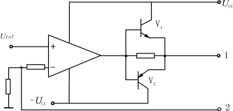 JTU—100型電子負載的原理圖如圖2所示,它最大可以吸收10A的電流,圖中V1、V2為調(diào)整管,Uref為可調(diào)基準源,1、2為輸出端,調(diào)節(jié)Uref的大小,不管負載如何變化,都可以在1、2端得到設定的電壓。