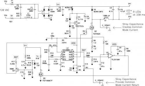 圖 1 是一個(gè) LED 電源的示意圖,其顯示了該降壓調(diào)節(jié)器中共模電流產(chǎn)生的主要原因。原因就是開關(guān)節(jié)點(diǎn)接地電容。令人驚訝的是,如此小的一點(diǎn)電容,仍會(huì)產(chǎn)生問題。CISPR B 類(適用于住宅設(shè)備)輻射規(guī)定允許 1 MHz 下 46 dBuV (200 uV) 信號(hào)的 50 電源阻抗。這也就是說,僅允許 4 uA 的電流。如果轉(zhuǎn)換器在 100 kHz 下對(duì) Q2 漏極的 200 Vpk-pk 方波進(jìn)行開關(guān)操作,則基準(zhǔn)電壓約為 120 伏峰值。由于諧波隨頻率降低而成比例下降,因此 1MHz 下會(huì)有約 9 Vrms。我們可以利用它來計(jì)算允許電容,得到約 0.1pF,即 100 fF(相當(dāng)于 1 MHz 下 2 兆歐阻抗),其為這個(gè)節(jié)點(diǎn)完全可能的電容量。另外,還存在電路接地其余部分的電容,其為共模電流提供了一條返回通路,如圖 1 所示 C_Stray2。