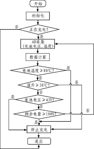 采用充電限壓,電池溫升檢測策略,如蓄電池電36 V,充電截止電壓42.5-43 V,充電截止溫度80℃,充電截止溫升30℃。不過絕大部分時間蓄電池基本處于欠充狀態(tài)。同時通過對電池電壓的數(shù)據(jù)實(shí)時采集,利用軟件控制對電池采取限壓保護(hù):通過實(shí)時計(jì)算電池電量進(jìn)行防過充過放保護(hù),電量為100%時停止充電,電量為20%時停止放電,為延長其壽命,做了第二道防線。圖1 為蓄電池過充保護(hù)流程圖。