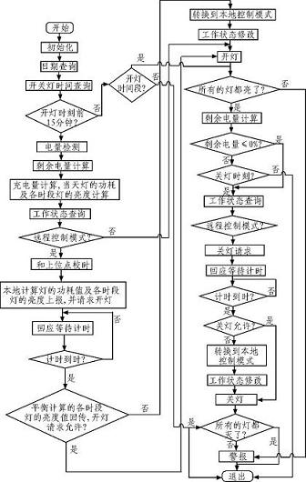 進(jìn)行太陽能路燈電池板電流檢測,蓄電池電壓檢測,蓄電池電量監(jiān)測,以及環(huán)境溫度的檢測,采用光開時關(guān),并實(shí)時上傳工作環(huán)境及狀態(tài)數(shù)據(jù),預(yù)警故障,保證系統(tǒng)的可靠性。圖2為太陽能路燈的開、關(guān)控制流程網(wǎng)。