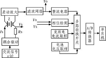 給電池施加一個固定頻率和固定電流(日前一般使用l kHz頻率、50 mA小電沆),然后對其電壓進(jìn)行采樣,經(jīng)過整流、濾波等一系列處理后通過運(yùn)放電路計(jì)算出該電池的內(nèi)阻值。圖4為在線測量剩余電量硬件框圖。