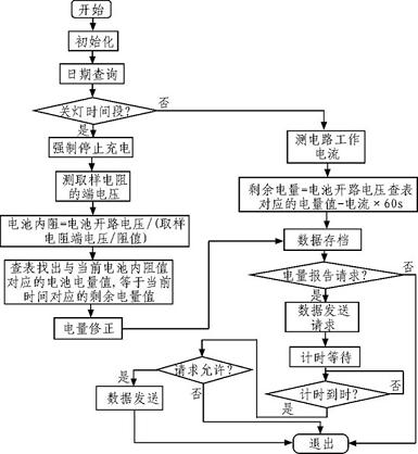 通過計(jì)算電流在時域上的積分,可得出電量變化值,在路燈工作前檢測到的電池電量作為初始電量,則剩余電量為初始電量減去電量變化值。同時通過對MPPT電路的輸出電流做積分,作為電量變化的校正值,從而得到較準(zhǔn)確的剩余電量值。圖5為剩余電量計(jì)算流程圖。