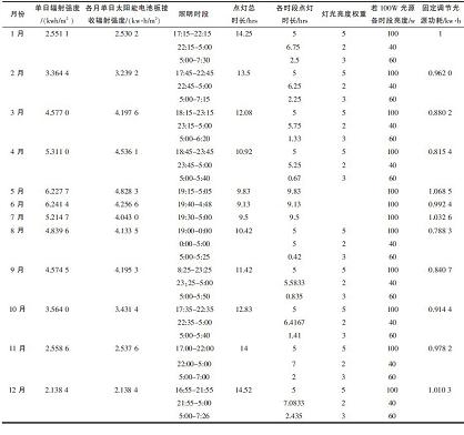 開關(guān)燈的時間根據(jù)天安門升降旗時間而定,如表1所示,全年最長點(diǎn)燈時長茌12月為14.52小時,最短為9.13小時。照明時間分為3個時段,第一個時段從當(dāng)天天安門降旗時刻開始,為5個小時,第二個時段到早上5點(diǎn),第三個時段從5點(diǎn)到滅安門升旗時刻,燈光亮度各時段權(quán)重比為5:2:3,如果以100 W光源為設(shè)計(jì)標(biāo)準(zhǔn),則光源功耗最大為1.068 5 kW-h。
