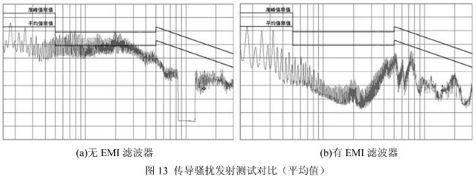 圖 13 是電源端子騷擾電壓的對比測試圖,圖(a)是未加 EMI 濾波器測試的,圖(b)是同一臺 IGBT 逆變焊機加裝 EMI 濾波器后測試的,無 EMI 濾波器時在低頻、中頻段均超標,加上 EMI 濾波器后,低頻、中頻段傳導騷擾顯著降低,但在 5~8MHz 頻段出現(xiàn)諧振(不超標) ,測試結果符合 GB15579.10-2008 的要求。