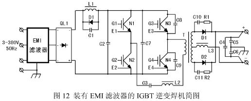 圖 12 是裝有 EMI 濾波器的 IGBT 逆變焊機原理簡圖。為了減少對相鄰設備的干擾和減少高頻電磁輻射對焊工健康的影響,在焊機輸出端也接了濾波器,其中 C4 用于輸出差模干擾的濾出,C5、C6 用于共模干擾濾出。