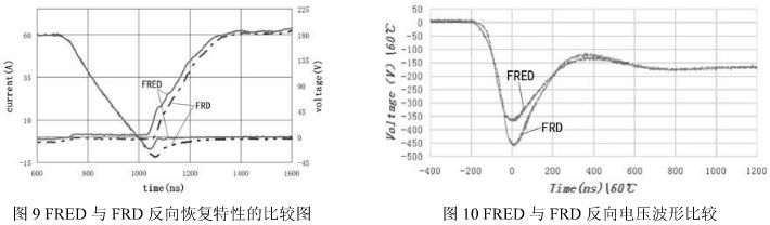 例如FRED就較一般的FRD在恢復時間、反向電壓等方面有一定的優(yōu)勢。圖9是一種國產(chǎn)FRED與進口FRD反向恢復特性的比較,圖10是國產(chǎn)FRED與進口FRD反向電壓波形比較。