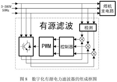 有源濾波器原理如圖 8 所示。通過檢測電路對負載端(焊機主電路)的電壓、電流進行檢測,然后送入控制電路進行計算分析,輸出相應的脈沖驅動 IGBT,產(chǎn)生與負載電流中的諧波電流大小相等方向相反的電流,從而達到補償負載電流中的諧波分量和無功功率的目的。逆變器工作時所需要的能量由儲能電路供給,該儲能電路是通過逆變器中的各個 IGBT 的反并聯(lián)二極管進行充電,同時又在 IGBT 開通時輸出能量,使諧波電流分量和無功功率得到補償。這樣,電網(wǎng)的輸入電流可實現(xiàn)為正弦波形。 有源濾波器動態(tài)響應迅速,濾除諧波可達到 95%以上,補償無功細致。但有源濾波器由于電路復雜,材料成本高,運行可靠性也不及無源濾波電路,對市場價格競爭異常激烈的 ZX7、NB 系列逆變焊機而言不太適用,但對需要作精細控制的數(shù)字化焊機而言,可能有源濾波才是其最佳選擇。