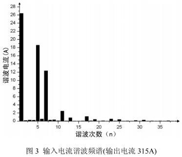圖 3 是一臺無諧波抑制措施的 IGBT 逆變焊機輸出 315A電流時的輸入電流諧波頻譜, 諧波畸變率高達64%,大大超過了 GB15579.10-2008標準中表 B7諧波畸變率(THD)48%的限值,其 5 次、7 次諧波電流幅值過大是 THD 超標的主要原因,11、13 次諧波電流符合標準限值要求。由此可見,低頻諧波幅值過大是 THD超標的主要原因。同時,諧波畸變率高還會對 IGBT 逆變焊機的全功率因數(shù)產(chǎn)生不利影響。