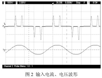 圖 2 是 IGBT 逆變焊機的輸入相電流、電壓波形。由圖 2 可見,輸入電流已不再是正弦波,而是一種前后沿都比較陡峭的脈沖,由整流、濾波引起的電流波形畸變是 IGBT 逆變焊機的共性問題。畸變的電流、電壓高次諧波會沿電源電纜、供電網(wǎng)絡產(chǎn)生傳導騷擾和輻射騷擾,由于頻率相對較低,其輻射水平并不會很高。