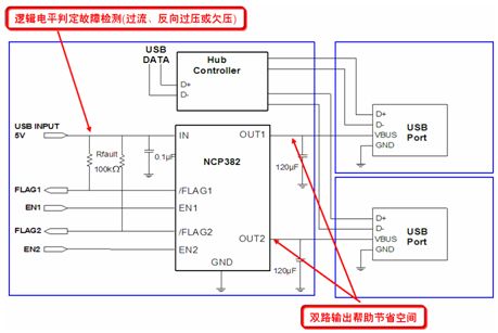 NCP382則是一款功率分配開關,其設計針對很可能會遇到大的電容性負載或短路的應用。實際上,越來越多便攜電子設備采用USB供電,但需要保護本地USB電源夠用受外部Vbus故障影響。NCP382能夠通過在輸出負載超過限流閾值或出現(xiàn)短路時切換至恒流模式,將輸出電流限制在期望的電平(0.5 A、1 A或1.5 A),從而提供過流保護。NCP381接收2.5 V至5.5 V的單路輸入,提供2路輸出。圖6是NCP382的典型應用電路圖。