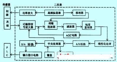 系統(tǒng)主要由傳感器和二次表組成。二次表主要由高頻振蕩器、可編程信號放大器、相敏檢波器、濾波器、幅度鑒別器、agc電路、線性化處理等電路構(gòu)成。本文就系統(tǒng)關(guān)鍵部分電路的原理及作用加以論述。