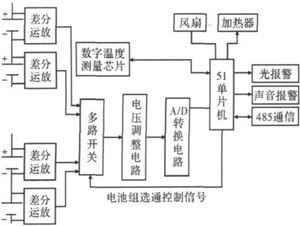 具有高電壓、高容量、循環(huán)壽命長、安全性能好等優(yōu)點(diǎn)的鋰離子電池,在便攜式電子設(shè)備、電動(dòng)汽車、空間技術(shù)、國防工業(yè)等多方面具有廣闊的應(yīng)用前景。由若干節(jié)鋰離子電池經(jīng)串聯(lián)組成的動(dòng)力鋰離子電池組目前應(yīng)用最為廣泛。由于每節(jié)單體電池的電壓不一致,使用中電池不允許過充電、過放電,電池的性能和壽命受溫度影響較大等特點(diǎn),必須對(duì)串聯(lián)鋰離子電池組進(jìn)行監(jiān)測(cè),確保在使用中鋰離子電池具有良好的狀態(tài),或者使用中電池出現(xiàn)問題立即報(bào)警,電源管理系統(tǒng)立即采取保障措施,并提醒相關(guān)人員檢修。單體電壓和電池組的溫度是辨別串聯(lián)鋰離子電池組是否正常工作的主要技術(shù)指標(biāo)。文獻(xiàn)[1]采用直接采樣法,將要測(cè)量的單體電池電壓存儲(chǔ)在非電容上進(jìn)行測(cè)量。該方法反應(yīng)時(shí)間慢、誤差較大、控制復(fù)雜;文獻(xiàn)[2]采用運(yùn)放和光藕繼電器來測(cè)量串聯(lián)電池組的單體電壓。該方法對(duì)光耦的線性度要求很高,導(dǎo)致硬件成本較高。目前,直接采用集成芯片的串聯(lián)鋰離子電池組監(jiān)控系統(tǒng)受到青睞,但該方法串聯(lián)電池的數(shù)目固定,導(dǎo)致應(yīng)用不靈活、硬件成本高等缺點(diǎn)。文中研制了一種動(dòng)力鋰離子電池組監(jiān)測(cè)系統(tǒng),對(duì)串聯(lián)鋰離子電池組的單體電壓和電池組的溫度進(jìn)行在線監(jiān)測(cè),當(dāng)單體電池電壓偏離規(guī)定區(qū)間時(shí),監(jiān)測(cè)系統(tǒng)啟動(dòng)報(bào)警程序進(jìn)行聲、光報(bào)警;當(dāng)電池組溫度偏離規(guī)定的區(qū)間時(shí),監(jiān)測(cè)系統(tǒng)啟動(dòng)風(fēng)扇或加熱控制電路,并存儲(chǔ)有關(guān)數(shù)據(jù),確保電池組正常工作。整個(gè)監(jiān)測(cè)系統(tǒng)具有連續(xù)測(cè)量分量、簡(jiǎn)單經(jīng)濟(jì)、精度高和可靠性高的特點(diǎn)。