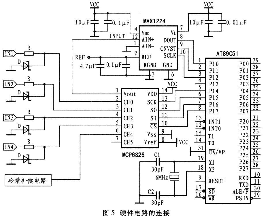設(shè)計(jì)要求4路溫度檢測(cè)通道和l路冷端補(bǔ)償電路,所以本設(shè)計(jì)采用MCP6S26型6通道增益可編程放大器,該放大器特別適用于多路信號(hào)采集電路的設(shè)計(jì),由于AT89C51單片機(jī)可以通過(guò)軟件對(duì)模擬信號(hào)電路進(jìn)行控制,所以其適應(yīng)性和靈活性大大提高。但是,由于AT89C51型單片機(jī)沒(méi)有3線(xiàn)制串行總線(xiàn)接口,它與MCP6S26進(jìn)行3線(xiàn)制串行總線(xiàn)的連接時(shí),要使用軟件來(lái)模擬3線(xiàn)制串行總線(xiàn)的操作,包括串行時(shí)鐘數(shù)據(jù)輸入和數(shù)據(jù)輸出。McP6S26與AT89C51的連接如圖5所示。圖中,P17模擬片選端CS,P14模擬時(shí)鐘輸入端SCK,P16模擬數(shù)據(jù)輸入端SI,P15模擬數(shù)據(jù)輸出端SO。