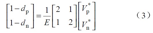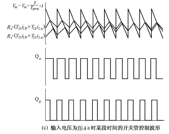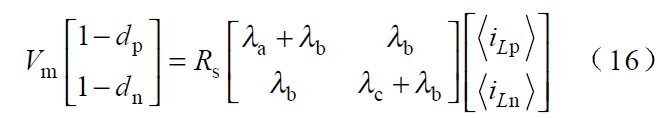 圖中 Vp 、Vn 為不同區(qū)間所對應(yīng)的電壓,Lp、 Ln 和Lt 為不同區(qū)間所對應(yīng)的電感,Tp、 Tn 為不同區(qū)間所對應(yīng)的主控開關(guān),dp 、dn 為主控開關(guān)的占空比。由于PWM 開關(guān)頻率遠(yuǎn)高于電網(wǎng)頻率,因此,在一個開關(guān)周期內(nèi),各電感的電壓平均值為零,運(yùn)用回路電流法和節(jié)點(diǎn)電壓法對各種開關(guān)狀態(tài)進(jìn)行分,析可得出: