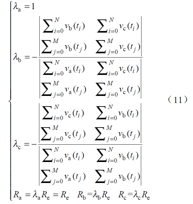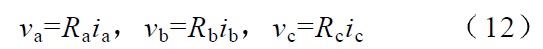 式 (11 )為相電壓不對稱系數(shù)的計(jì)算公式,其中λa ,λb 和λc 為相電壓不對稱系數(shù),Re 為標(biāo)準(zhǔn)等效電阻??梢?,當(dāng)電網(wǎng)電壓不對稱時,為使各相電流仍能正確跟蹤對應(yīng)相電壓,各相等效電阻值是不同的。特殊地,如果三相電壓對稱,λa=λb=λc =1 ,則Ra=Rb=Rc=Re.