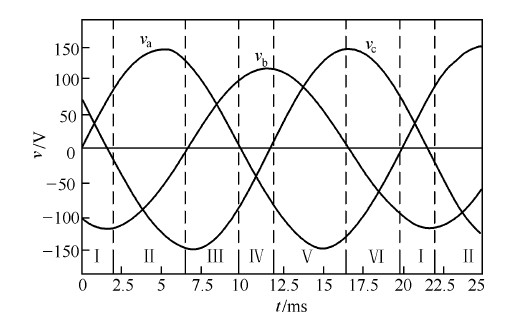 圖 1 給出了雙并聯(lián)升壓型三相整流器的主電路原理圖。另外,圖2 還給出了輸入電壓b 相幅值減少20% ,c 相相位滯后30 °時三相電壓的波形,并按虛線劃分為六個區(qū)間。須注意的是,輸入電壓不對稱的情況不同,其分區(qū)點(diǎn)也可能不同,分區(qū)點(diǎn)由各相非零序電壓瞬時最大幅度區(qū)分點(diǎn)所確定。依據(jù)六階段PWM 控制技術(shù)原理,三相整流器可以通過在線性周期的每一區(qū)間內(nèi)控制兩個開關(guān)的通斷來實(shí)現(xiàn)單位功率因數(shù)。