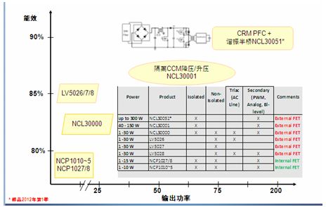 在安森美半導(dǎo)體用于LED照明的AC-DC電源方案中,1至10 W的照明應(yīng)用中推薦使用NCP1010~5,1至15 W可使用NCP1027/8,這些方案集成了MOS管,適用于隔離和非隔離應(yīng)用,支持次級PWM調(diào)光、模擬調(diào)光或雙亮度等級調(diào)光,能效高達75-80%;1至30 W的應(yīng)用可以使用LV5026、5027、5028,支持隔離方案,典型能效85%左右;1至40 W推薦使用NCL30000,可進行初級可控硅調(diào)光,適用于隔離和非隔離方案,隔離方案能效80-85%。40至150 W推薦使用NCL30001,它是一個連續(xù)導(dǎo)電模式(CCM)控制芯片,隔離方案的典型能效85-90%;更大功率推薦使用NCL30051。圖2是這些方案輸出功率與能效的對比。以下將具體介紹這些方案的功能和特點。