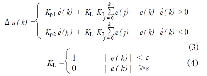③當(dāng)│e(k)│≤ε時(shí),即偏差值e(k)進(jìn)入穩(wěn)態(tài)區(qū)域時(shí),加入積分環(huán)節(jié),可保證系統(tǒng)的控制精度。