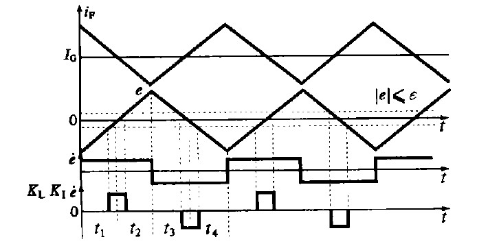 ④在區(qū)間1 和區(qū)間3 中,系統(tǒng)輸出在調(diào)節(jié)器的作用下向給定值I G 接近。為了減小系統(tǒng)穩(wěn)態(tài)誤差,提高控制精度,采用大比例調(diào)節(jié)系數(shù)KP1使反饋電流i F 迅速接近I G.但KP1的增大會(huì)使系統(tǒng)的相對(duì)穩(wěn)定性降低,甚至造成系統(tǒng)不穩(wěn)定,所以在區(qū)間2和區(qū)間4 采用小比例調(diào)節(jié)系數(shù)KP2 ,以降低電流反饋值偏離給定值的速度。