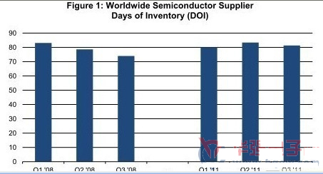 第三季度半導(dǎo)體庫(kù)存天數(shù)(DOI)為81天,比第二季度的83天下降2.5%。自從2009年第四季度以來(lái),庫(kù)存天數(shù)就持續(xù)增加。2009年第四季度庫(kù)存天數(shù)只有67天,由于需求在衰退時(shí)期蒸發(fā),當(dāng)時(shí)庫(kù)存較低。此后,庫(kù)存天數(shù)不斷攀升,如圖1所示。庫(kù)存上升,一方面是因?yàn)樾枰a(bǔ)充衰竭的庫(kù)存,同時(shí)也是為了滿足不斷增長(zhǎng)的需求。第三季度庫(kù)存約為369.6億美元,低于第二季度時(shí)的372.9億美元。
