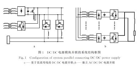 DC/DC電源并聯(lián)有兩種拓撲結(jié)構(gòu),一種是采用輸入直流母線結(jié)構(gòu),其系統(tǒng)結(jié)構(gòu)框圖如圖1a所示,主要包括整流變壓器和不可控二極管整流電路,N 路DC/DC變換器,泵升電壓抑制電路等;另一種是采用獨立的AC-DC/DC電源并聯(lián),系統(tǒng)結(jié)構(gòu)圖如圖1b所示。