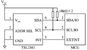 TSL2561可以通過(guò)I2C總線訪問(wèn),所以硬件接口電路非常簡(jiǎn)單。如果所選用的微控制器帶有I2C總線控制器,則將該總線的時(shí)鐘線和數(shù)據(jù)線直接與TSL2561的I2C總線的SCL和SDA分別相連;如果微控制器內(nèi)部沒(méi)有上拉電阻,則還需要再用2個(gè)上拉電阻接到總線上。如果微控制器不帶I2C總線控制器,則將TSL2561的I2C總線的SCL和SDA與普通I/O口連接即可;但編程時(shí)需要模擬I2C總線的時(shí)序來(lái)訪問(wèn)TSL2561,INT引腳接微控制器的外部中斷。硬件連接如圖3所示。