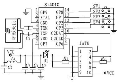 無線電發(fā)射系統(tǒng)是以Si4010 為核心來設(shè)計。Si4010 的4 個輸入輸出端口與按鍵直接相連,內(nèi)部電路可直接采集按鍵狀態(tài)信息。Si4010 的信號差分輸出端TXM、TXP 分別與環(huán)形天線的兩端連接,環(huán)形天線直接印制在PCB 板上,減少了發(fā)射系統(tǒng)體積。采用C2 接口編程,Si4010 的C2DATA、C2CLK 端口與JTAG 接口的4 個端口相連。C3、C4、C5組成電源濾波電路。發(fā)光二極管提供按鍵動作指示,當(dāng)有按鍵按下時,放光二極管亮,沒有按鍵按下,放光二極管滅。無線電發(fā)射系統(tǒng)的主要功能是在Si4010 內(nèi)部MCU的控制下采集按鍵電路的狀態(tài)信息, 實現(xiàn)數(shù)據(jù)加密和編碼,再進行FSK 調(diào)制,調(diào)制后信號經(jīng)放大調(diào)諧,由環(huán)形天線發(fā)射出去。